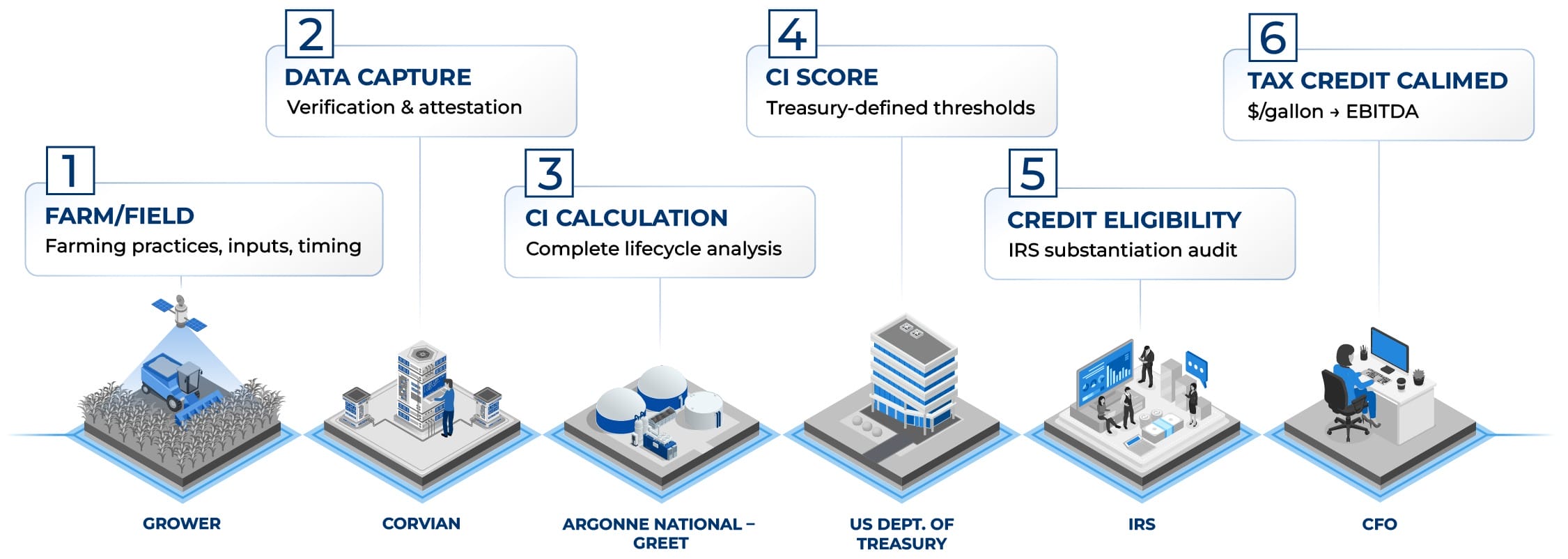 O 45Z percorre uma cadeia de valor fixa. A Corvian apoia o fator mais crítico de sucesso, garantindo que os dados em nível de campo que alimentam essa cadeia sejam confiáveis, defensáveis e prontos para auditoria.